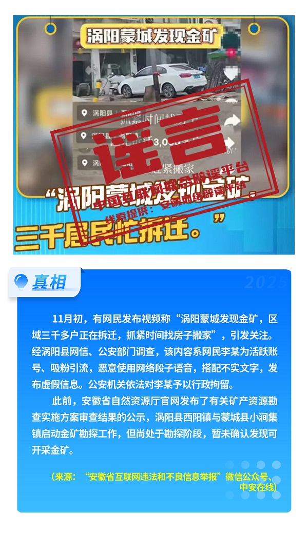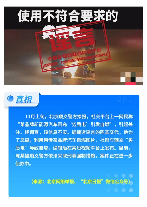 国家网信办近日会同工业和信息化部等部门深入开展汽车行业网络乱象专项整治行动,从严整治散布虚假不实信息,恶意抹黑诋毁汽车企业、汽车产品等违法违规行为,对违规账号依法依约采取处置措施。针对不法分子利用AI技术冒用公众人物形象直播带货乱象,同步开展专项行动,严厉处置一批违法违规网络账号,清理相关违规信息8700余条,处置仿冒公众人物账号1.1万余个。公安机关严厉打击造谣传谣违法行为,上述“充‘劣质电’会导致新能源汽车自燃”“安徽涡阳蒙城发现金矿,三千居民忙拆迁”“内蒙古赤峰一菜地可免费采摘白菜”等谣言制造者,均已被依法查处。